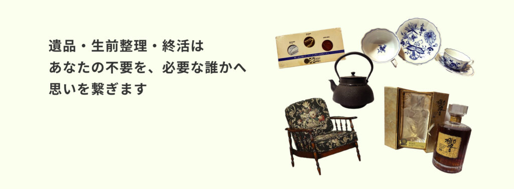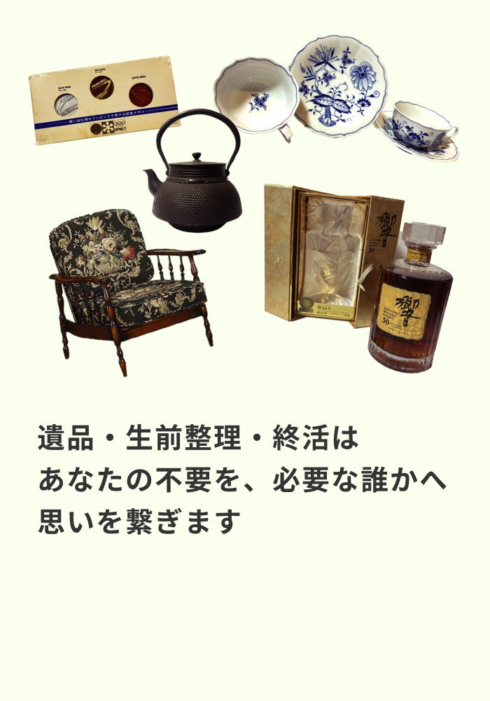 ご家族の知らない遺品の価値を最大限に見出し、可能な限りのお品を買取いたします。 幅広い品目の査定・買取を一括でお受けできるのが特徴です。箪笥や押し入れから荷物を出す作業や仕分けなど、どのようなことでもお気軽にご相談ください。