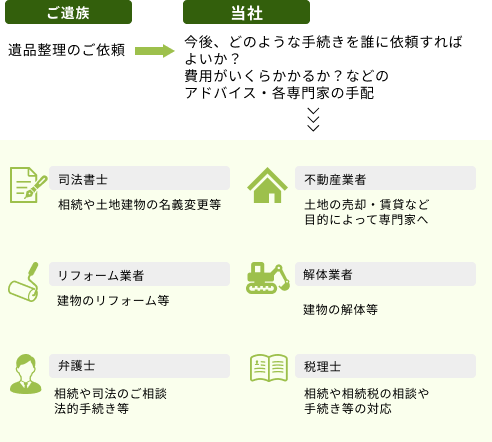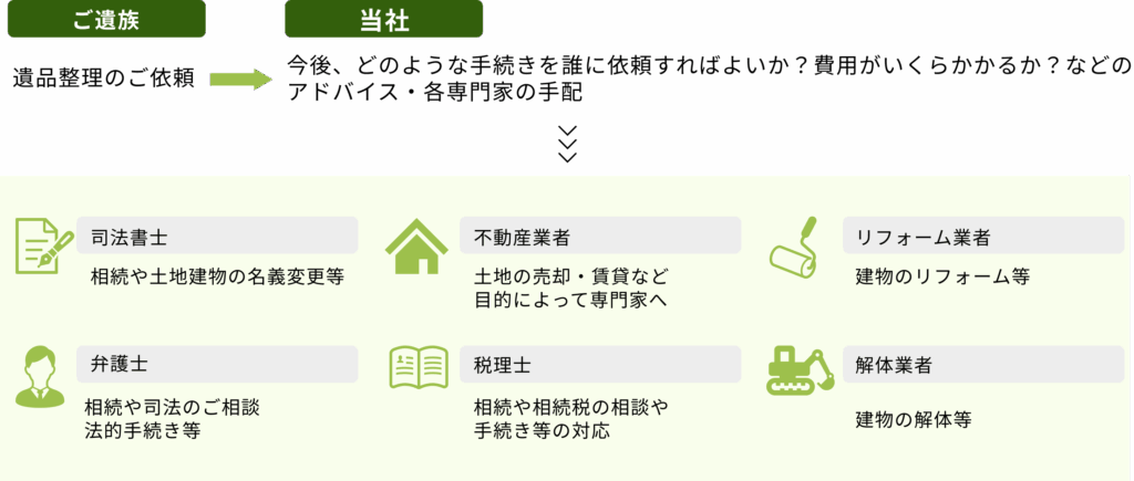専門家との連携で、遺品・生前整理にまつわるこれらのお手伝いも致します。